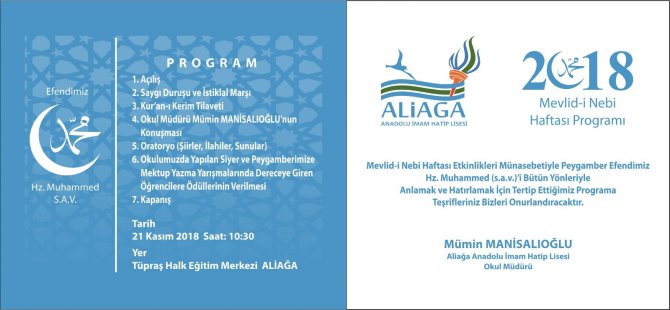 İzmir’in Aliağa ilçesinde Anadolu İmam Hatip Lisesi tarafından Mevlid-i Nebi Haftası etkinlikleri münasebetiyle program düzenlenecek.