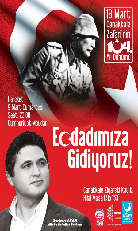 Aliağa Belediyesi, Çanakkale Zaferi’nin 104.Yılı ve Şehitleri Anma Günü etkinlikleri kapsamında Çanakkale Şehitliği’ne ve Tarihi Yarımada’ya ziyaret düzenleyecek. Şehitlik ziyaretine katılmak isteyen vatandaşlar kayıt için Aliağa Belediyesi giriş katında hizmet veren Hilal Masa Birimine kimlik fotokopileri ile şahsen müracaat edebilecek.