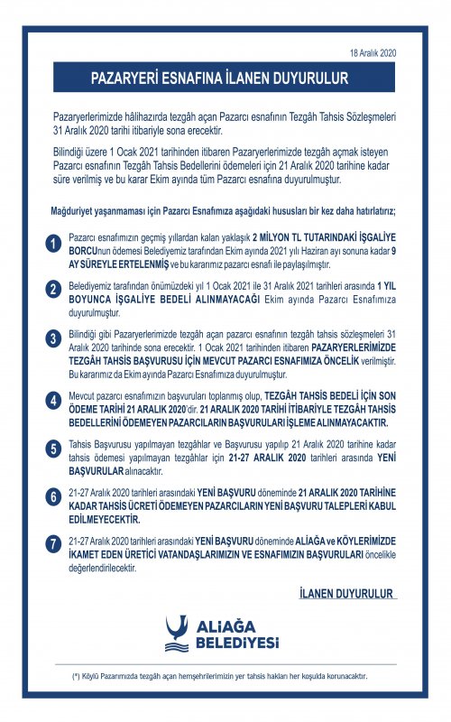 Aliağa’da bulunan Cumartesi Kapalı Pazar Yeri, Yeni Mahalle Kapalı Pazar Yeri, Yeni Şakran ve Helvacı Kapalı Pazar Yerleri’nde 1 Ocak 2021 tarihinden itibaren tezgâh açmak isteyen Pazarcı esnafına, Tezgâh Tahsis Bedellerini ödemeleri için 21 Aralık 2020 tarihine kadar süre verildi. Verilen süre Ekim ayında Aliağa’daki tüm pazarcı esnafına duyurulmuştu.