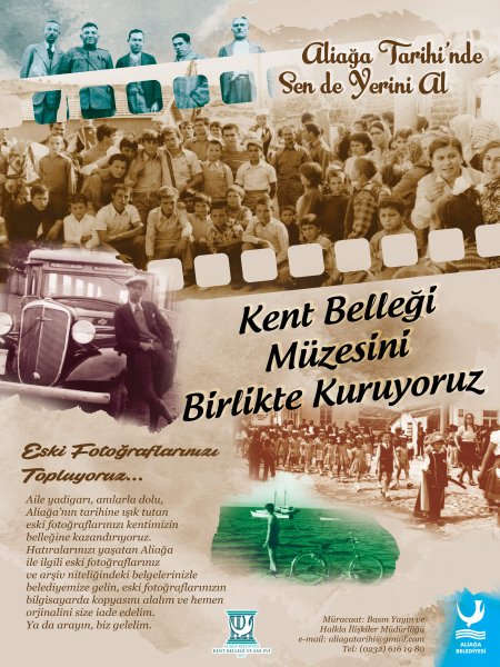 Bölgenin geçmişine ışık tutacak her türlü bilgi, belge, dokuman ve eşyanın sergileneceği bir “Aliağa Kent Belleği ve Anı Evi” kurulması için harekete geçen Aliağa Belediyesi, kampanya dâhilinde Aliağa’da yaşayan vatandaşların eski fotoğraf ve hatıra eşyalarını toplayarak arşivliyor.