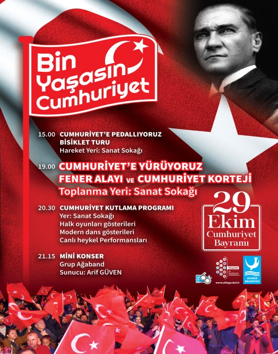 29 Ekim Cumhuriyet Bayramı etkinlikleri Aliağa Belediyesi tarafından düzenlenecek kutlama programı ile devam edecek. Aliağa Belediyesi tarafından organize edilecek kutlama programı kapsamında 29 Ekim akşamı on binlerce Aliağalı Fener Alayı’nda bir araya gelecek. Aliağalılar Sanat Sokağı’nda gerçekleştirilecek görsel şov ve konserlerle Cumhuriyet Bayramı’nı doyasıya kutlayacak.