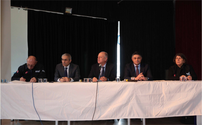 Aliağa Tüpraş Halk Eğitim Merkezi’nde gerçekleştirilen toplantıya; Vali Yardımcısı İsmail Çorumluoğlu, Aliağa Kaymakamı Zekeriya Güney, Aliağa Belediye Başkanı Serkan Acar, AFAD İl Müdürü Nazif Ekinci, AFAD Planlama ve Risk Azaltma Şube Müdürü Sezgin Kazaz, daire amirleri, muhtarlar, afet çalışma grupları ile ana çözüm ortaklarının yetkilileri katıldı.