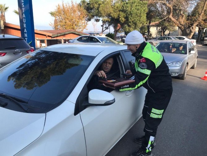 İzmir'de, Aliağa İlçe Emniyet Müdürlüğü'ne bağlı ekipler, kentin giriş ve çıkış noktalarında oluşturduğu kontrol merkezlerinde hem denetim yaptı hemde vatandaşlara çikolata ikram ederek yeni yılını kutladı.