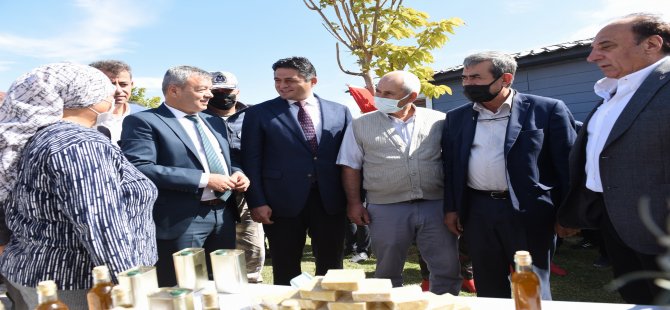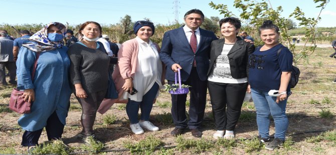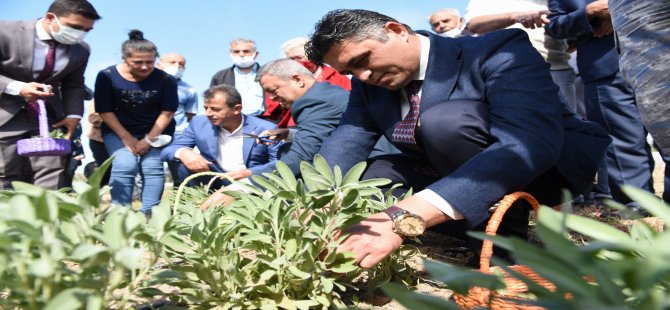 Yapılan konuşmaların ardından İlçe Kaymakamı Ömer Karaman ve Aliağa Belediye Başkanı Serkan Acar beraberindeki heyet, el emeği ve doğal ürünler stantlarını ziyaret ettikten sonra tarlaya inerek Anadolu Adaçayı ile İzmir Kekiğinin hasadını yaptı.