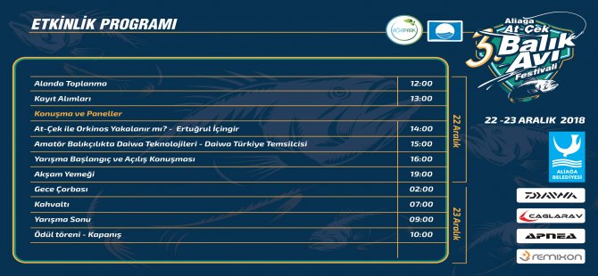 İki gün sürecek balık avı festivaline Çanakkale, Antalya, Manisa, Trabzon, Muğla, İstanbul, Denizli gibi Türkiye’nin birçok şehrinden 200 kişi kayıt yaptırdı. 22 Aralık Cumartesi günü saat 12.00’de başlayacak yarışma 23 Aralık Pazar günü saat 10.00’da düzenlenecek olan ödül töreni ile son bulacak. Aliağa Belediyesi’nin öncülüğündeki yarışmaya Çağlarav, Apnea, remixon ve Daiwa destek verecek.