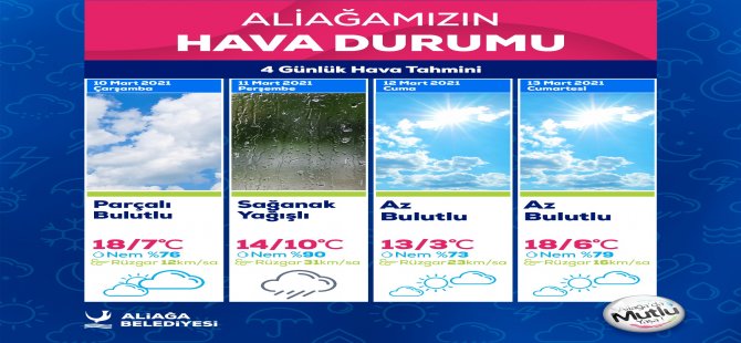 Meteoroloji 2. Bölge Müdürlüğü’nden edinilen bilgiye göre hafta boyunca Aliağa’da parçalı bulut hâkim olurken, hava sıcaklıkları 13 ile 18 dereceler arasında değişiklik gösterecek.